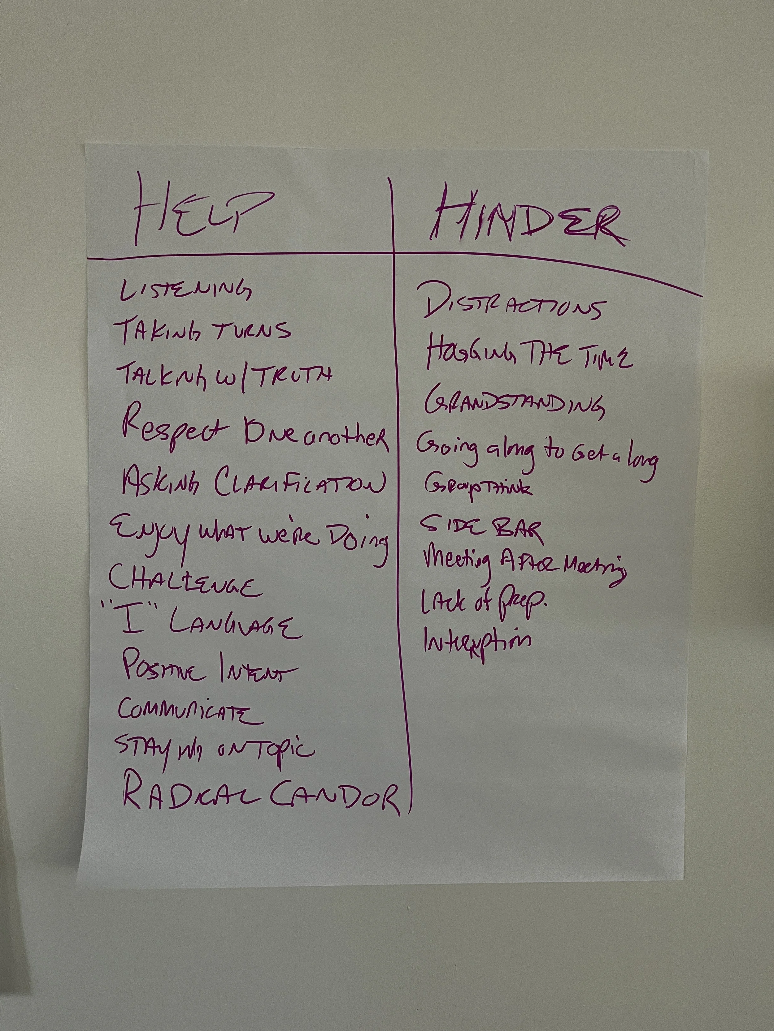I usually post a help/hinder list up as we meet as a team so that there is a visual display of helpful behaviors and hindering behaviors. When the list is visible, it becomes part of the room’s culture. You don’t need to call someone out harshly — a simple glance at the wall reminds the team of its own standards. The list becomes a silent facilitator, guiding tone, pace, and respect in every meeting.