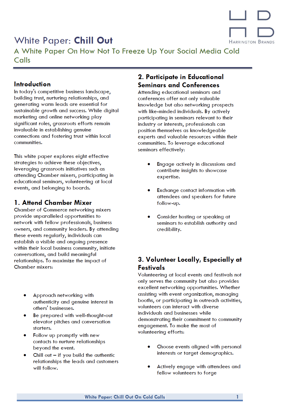 The white paper, "Chill Out: A White Paper On How Not To Freeze Up Your Social Media Cold Calls" is free, without any form for capturing your information so I can follow up with you in 30 seconds. No annoying forms, no pushy sales tactics, just pure civilized content.