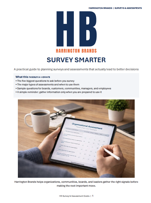 Full disclosure: at Harrington Brands, we believe deeply in assessments, and we offer a variety of them because we have seen firsthand how powerful they can be. Whether it is checking the temperature of your staff, board, customers, donors, members, or leadership team, a strong assessment gives leaders something better than assumptions. It gives them signal. We use surveys, focus groups, SWOT analysis, membership analysis, leadership assessments, customer service assessments, and other structured listening tools to help organizations better understand performance, satisfaction, alignment, and opportunity. At their best, these tools do not just produce data. They create clarity, surface patterns, and help leaders make smarter, more grounded decisions.